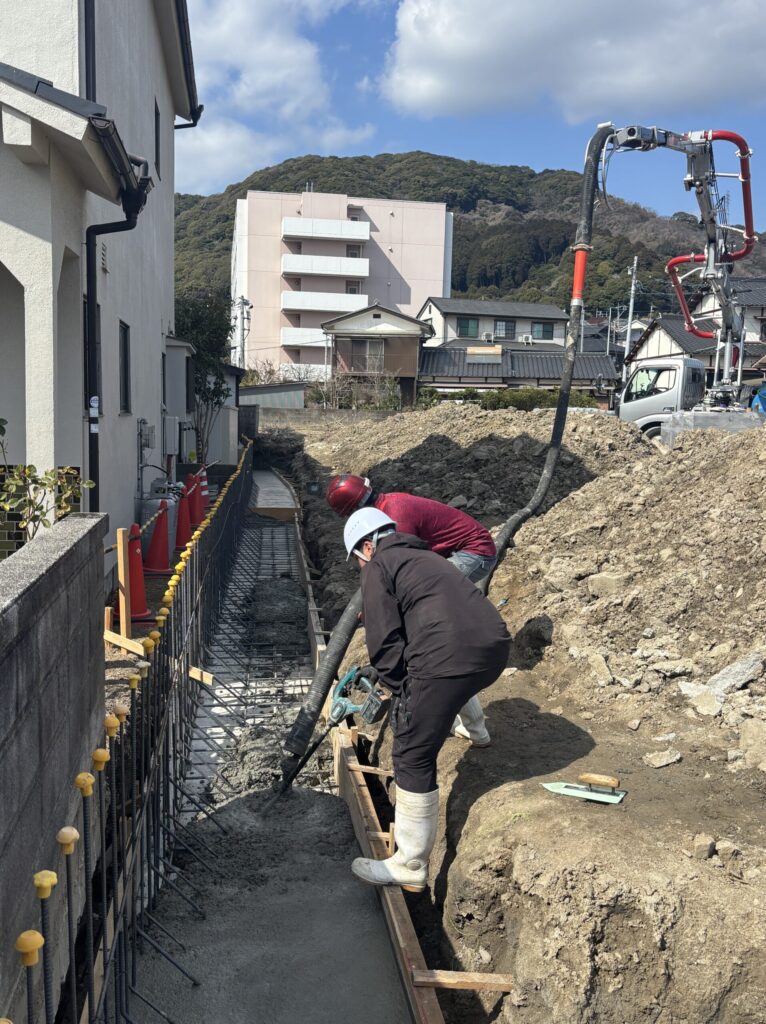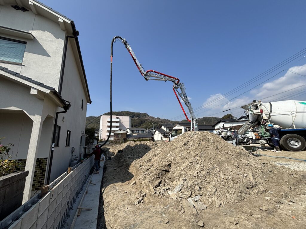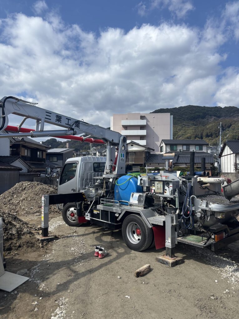 コンクリート打設は、ポンプ車を三葉工業さんに依頼し施工しました。