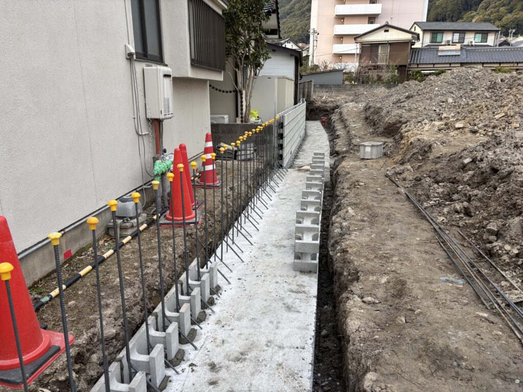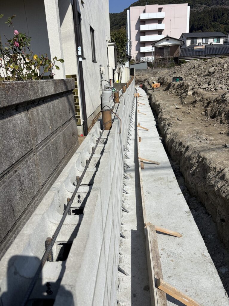 ベースコンクリート打設→型枠ブロック積→型枠ブロック打設